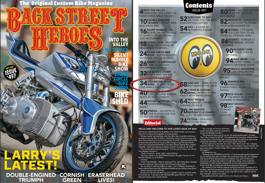 A dream of mine from the age of 13 when a chap gave me two copies of Easy Riders Magazine with scantily clad ladies all over the bikes, that was it for me, I wanted a bike in a magazine, when Back Street Heroes came out in 1983 I started to buy them from my local Smiths paper shop, I got to I seem to remember issue 40, I moved to Manchester to join a Speed Metal Band, I gave my collection to a young moped rider, who I could see was gonna be a biker one day, he was chuffed.. All these years later a dream of mine has come true...