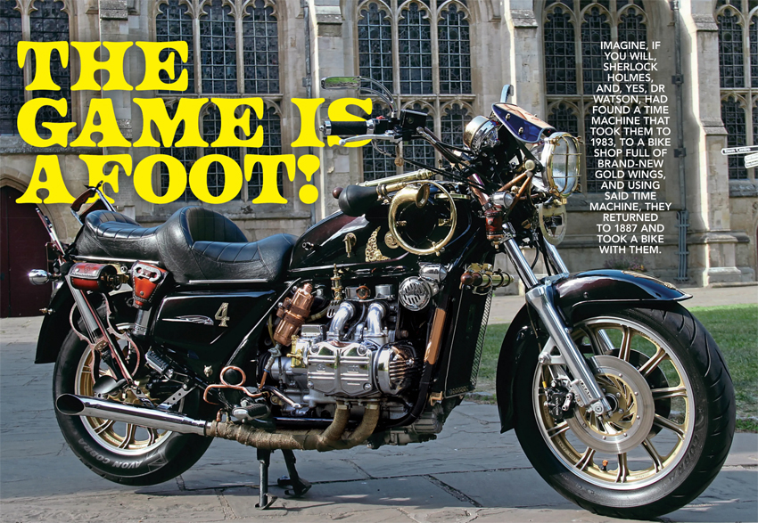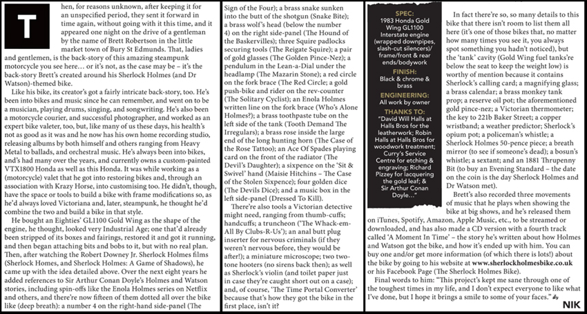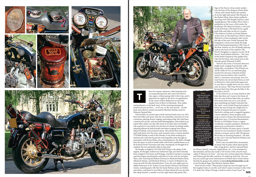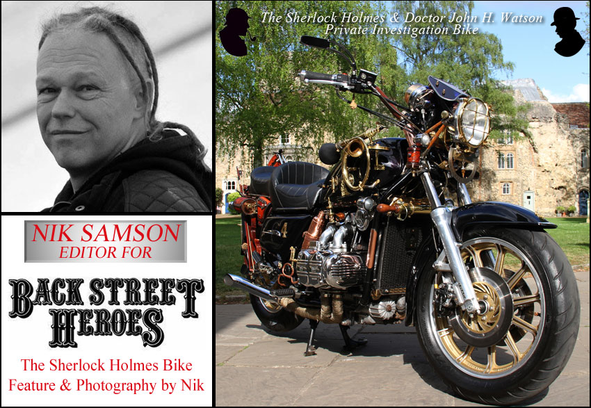 I met Nik whilst working at Krazy Horse Customs, a Motorcycle Emporium I worked at as a Motorcycle Valet, looking after their showroom bikes and customers bikes, I gave a dam good Valet after a service had been carried out. I retired to care for my parents but carried on helping Krazy Horse Customs run their open nights. I am part of the Parking Staff, been doing it for around 11 years now, a great night out if ever you are passing! First Thursday of the month April to October... Sometimes I take The Sherlock Homes Bike down to the open nights, it gets a lot of interest and hundreds of photos taken of it, makes me feel quite proud it does! lol... Anyway, Nik approached me and asked, "is this your bike?" I said yes!... He said "I can see your busy, I'm here at Krazy Horse tomorrow getting a bike I'm testing serviced, will you meet me to chat about your bike!?" I said yes again! lol... We sat had a good chin wag and he said I want to do a feature of your Sherlock Holmes bike in the Back Street Heroes Mag you up for that!? I said yes again! The rest is history, a year later Nik got in touch, we did a photo shoot at a local Cathedral grounds in my home town and the result is what you see above!