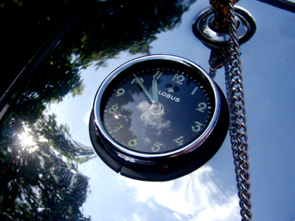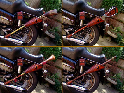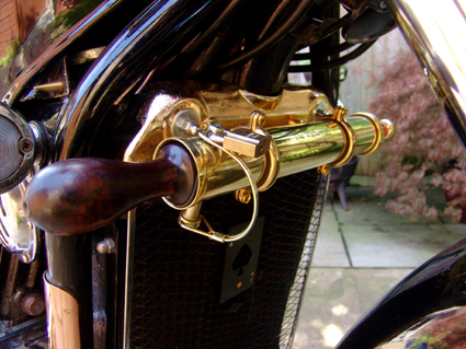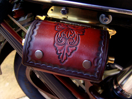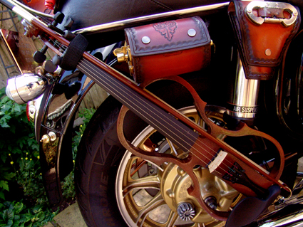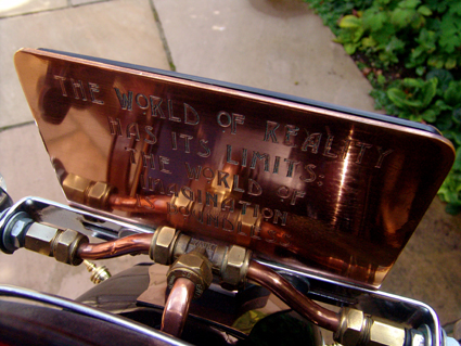 On both sides of the bike there are small brass lamps that have blue flashing lights
